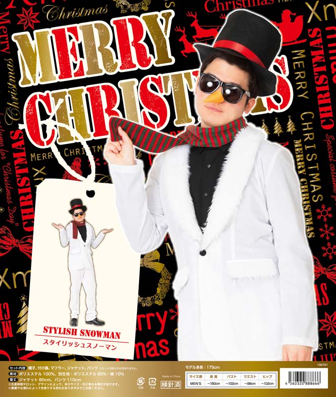 ■商品名:XM スタイリッシュスノーマン ■セット内容:帽子、付け鼻、マフラー、ジャケット、パンツ ■素材:ポリエステル100% ■洗濯表示:洗濯不可、塩素系漂白剤による漂白不可、アイロンは中温で当て布使用、ドライクリーニング不可 ■商品サイズ:袋入りパッケージ有(約W300×H450×D50mm) ■総重量:560g ■対応サイズ:Men's/身長 〜180cm、B 〜102cm、W 〜98cm、H 〜102cm ■メイン部分の長さ(着丈等):ジャケット80cm、パンツ110cm ■開き:ジャケット/前ボタン、パンツ/ウエストゴム ■モデル身長:175cm ■モデル着用サイズ:- ■B(実寸):106cm ■W(実寸):68〜100cm ■H(実寸):102cm ■肩幅(実寸):45cm ■袖丈(実寸):64cm ■股下(実寸):- ■モデル名:みしぇう ■原産国:中国 ■その他パーツ情報:頭囲57cm ■裏地の有無:無し ■商品について 注意事項 ※生産時期やロット、デザインによって、多少サイズ・色・柄が異なる場合があります。