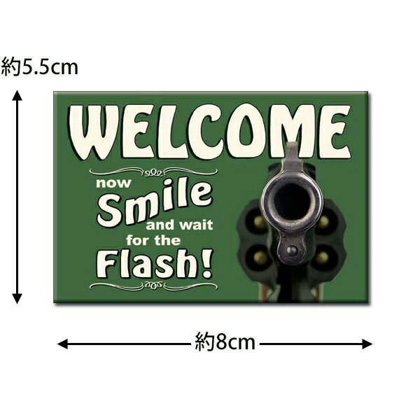 【商品詳細】 銃とポップなフォントの意外な組み合わせがおしゃれなブリキ缶マグネット!手のひらに収まるサイズです。
