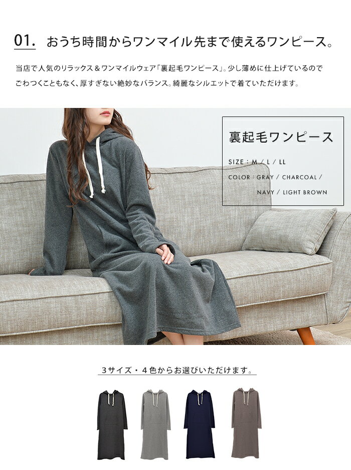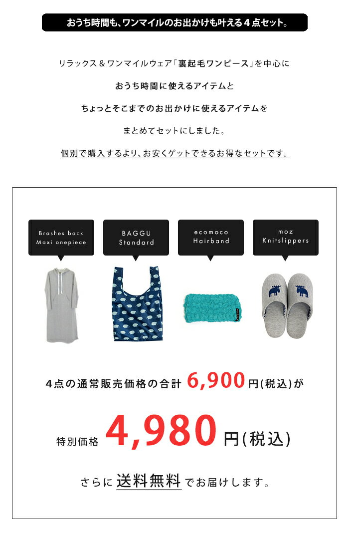 商品スペック 特長 リラックス&ワンマイルウェア「裏起毛ワンピース」を中心におうち時間に使えるアイテムとちょっとそこまでのお出かけに使えるアイテムをまとめてセットにしました。