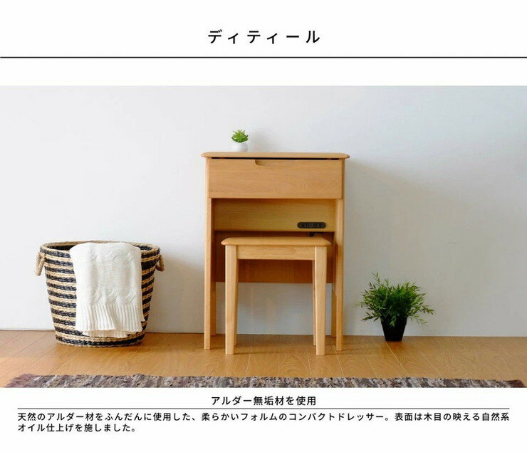 ドレッサー 幅52.5 コンパクト 完成品 天然木 無垢材 アルダー 北欧 おしゃれ 木製 ミラー コンセント 収納 天板 開閉 折り畳み(代引不可)【送料無料】